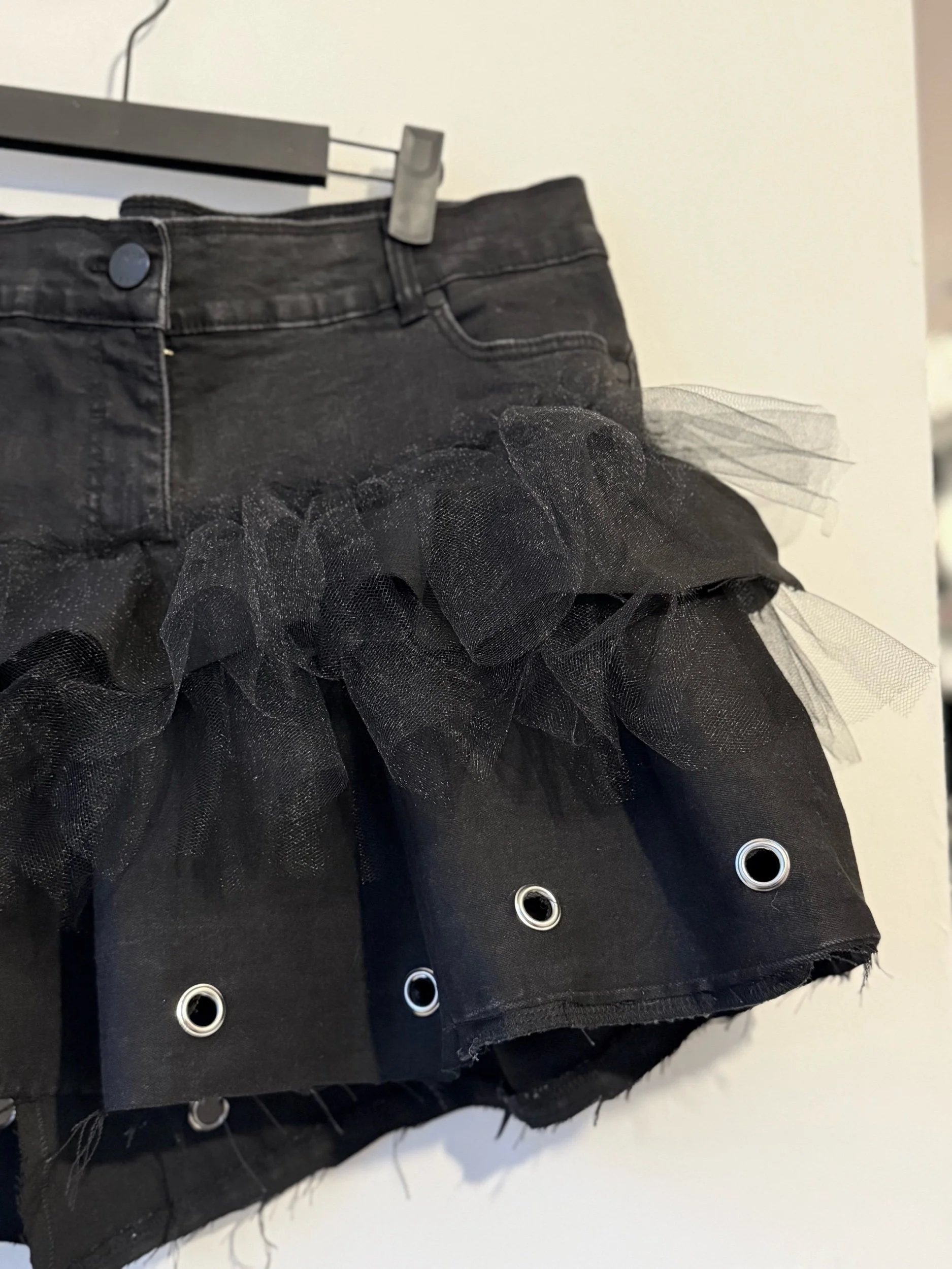 Reworked with layered sheer tulle ruffles for volume, with metal eyelet details and a soft satin ribbons