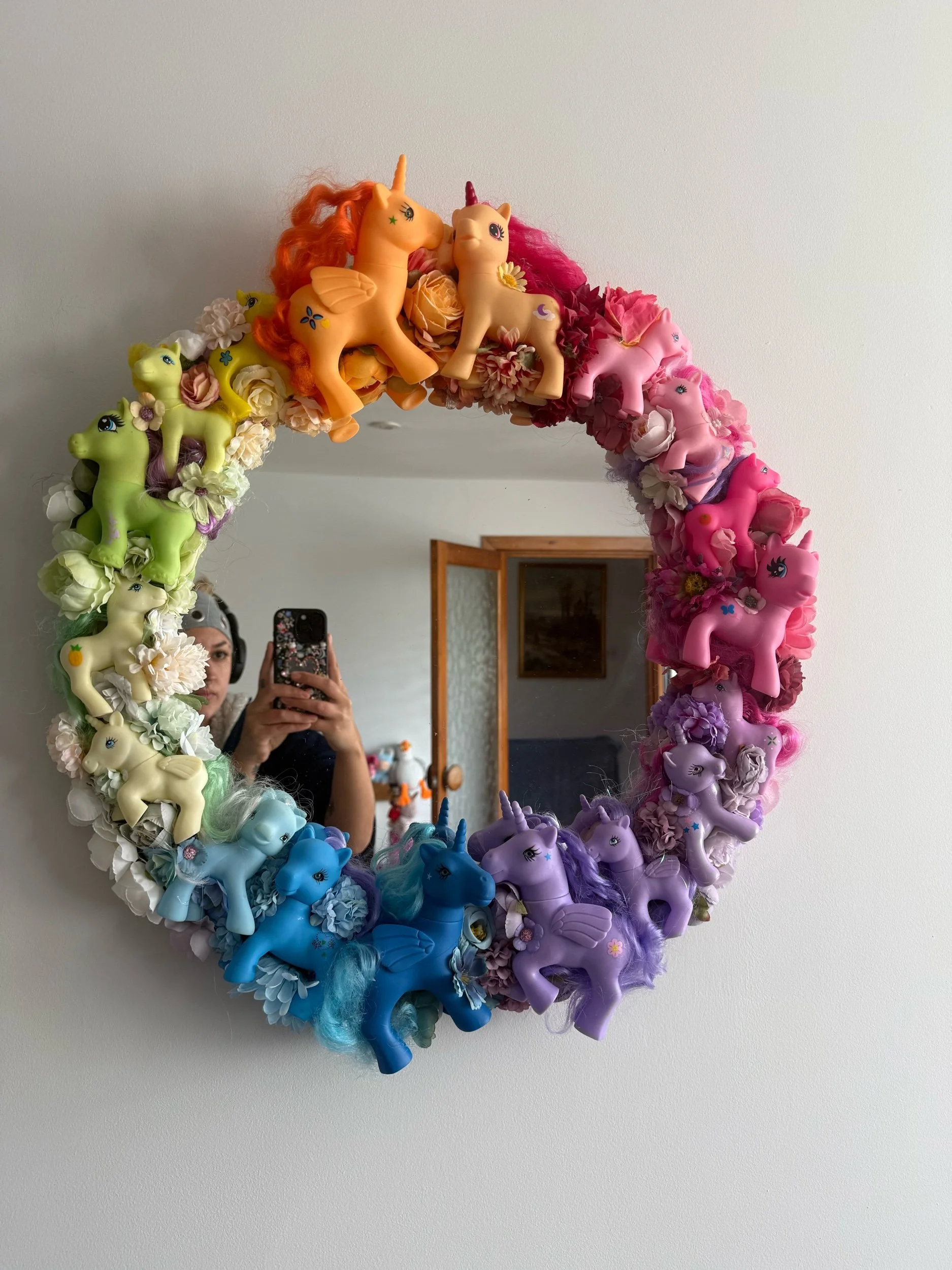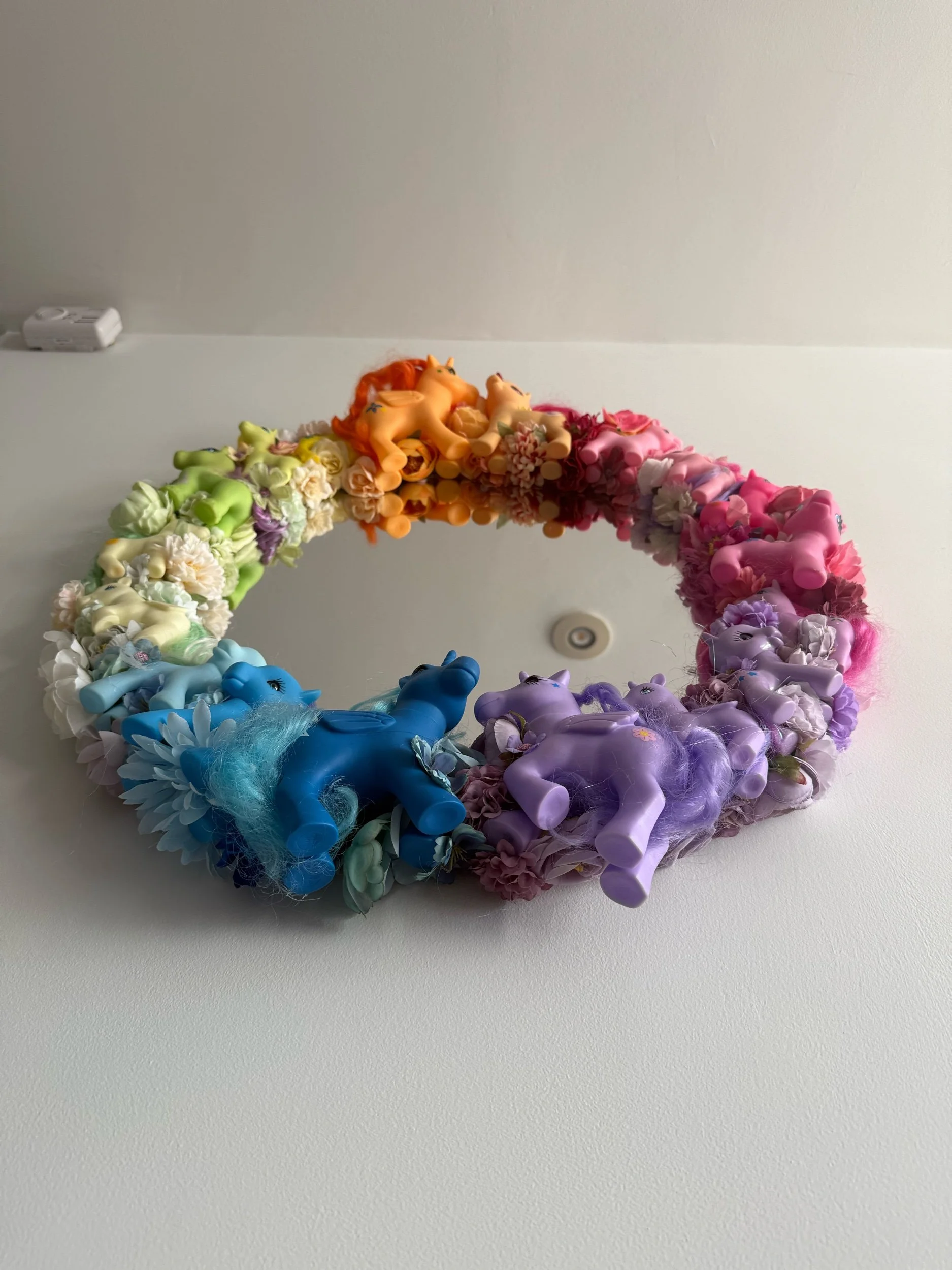 One of a kind upcycled Pink Pony Mirror. Hand crafted and full of character, with a 90s kid charm and colourful flowers throughout. This piece brings a little bit of charm and whimsy to any room. Perfect for maximalists, a hallway, bedroom, or as a quirky gift for someone who loves Ponies and unique decor.